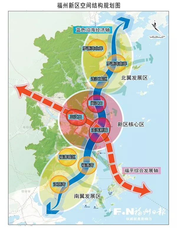 圍繞海峽、海絲、海洋“三海”跨越特色,福州新區初步明確了“兩大兩+”的發展戰略(即:大開放、大海灣,創新+、生態+),構建“一核兩翼兩軸多組團”的空間格局,建設開放新區、海灣新區、智慧新區、綠色新區。《福州新區發展規劃》已正式批復實施,《福州新區總體規劃》正進行修改完善,新區綜合交通、市政公用基礎設施等40項規劃將于年內編制完成。