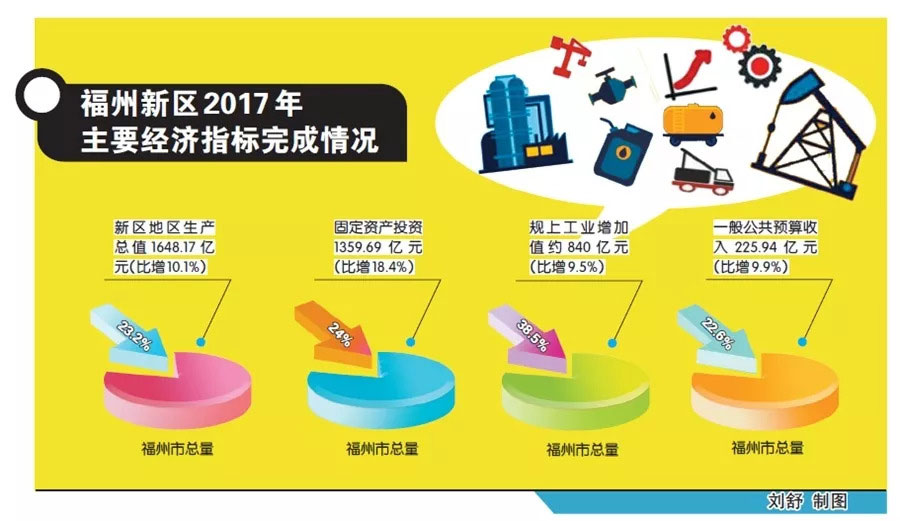 2017年福州新區地區生產總值1648.17億元,比增10.1%,固定資產投資1359.69億元,比增18.4%,規上工業增加值約840億元,比增9.5%,分別約占福州市總量的23.2%、24%、38.5%。大數據、物聯網等新興產業集聚發展,一批投資規模大、帶動力強的重大項目紛紛落地,逐步構建起支撐新區高質量發展的現代產業體系。